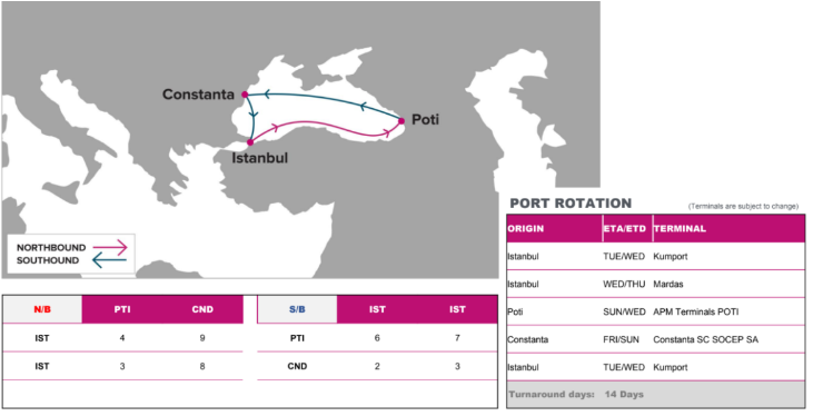 - Port rotation: Istanbul (Kumport/ Mardas) – Poti (APM) – Constanza (SOCEP) – Istanbul (Kumport)